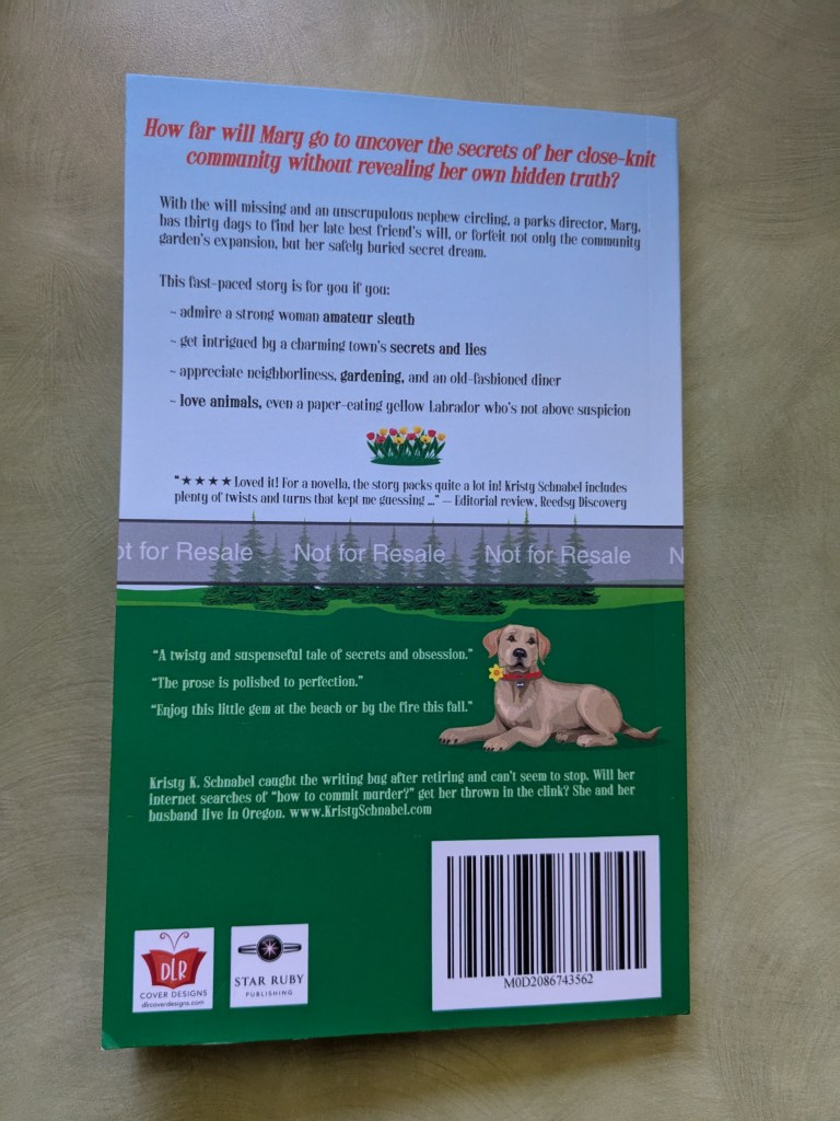 With the will missing and an unscrupulous nephew circling, a parks director, Mary, has thirty days to find her late best friend’s will, or forfeit not only the community garden’s expansion, but her safely buried secret dream.